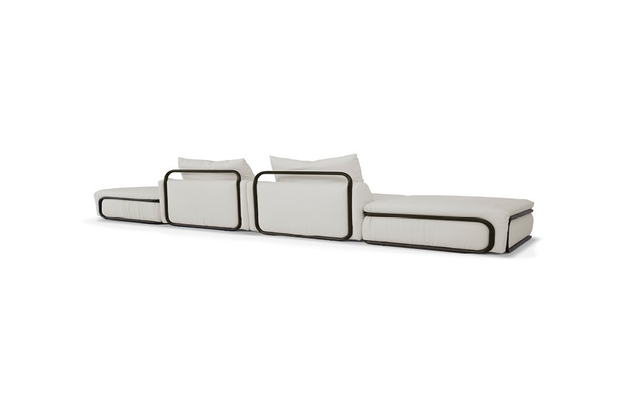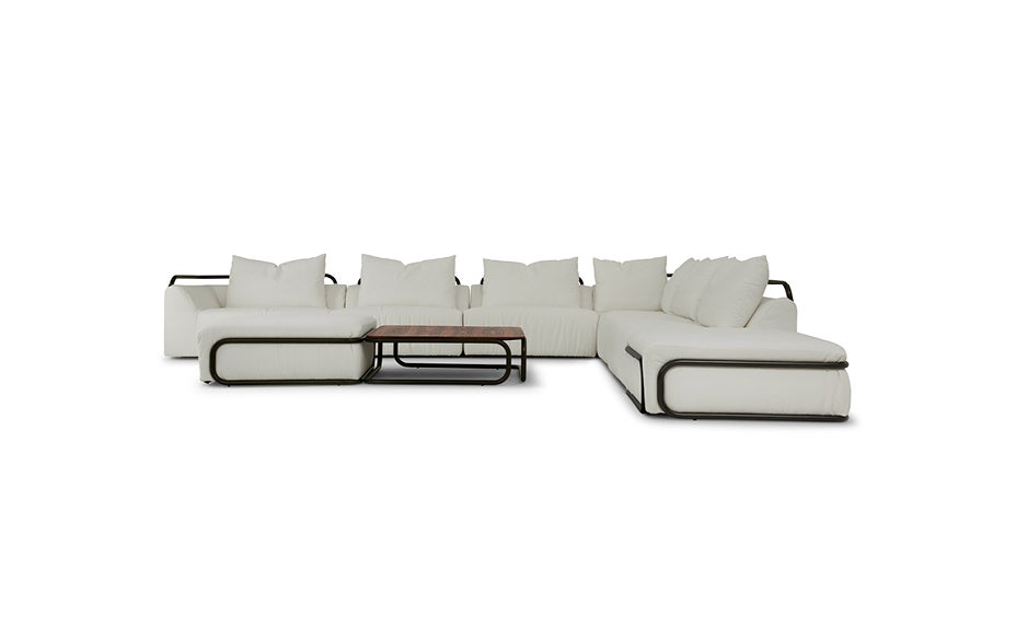 Com uma leve curva entre o assento e o encosto elaborados em peça única, permitem que o sofá modular Maraã possibilite diversas composições de uso, com diversas finalizações. Com braço, sem braço, puff lateral, mesa de madeira, além das peças soltas formando uma mesa de centro, faz referência ao Maranhão e ao movimento incansável das dunas dos Lençóis Maranhenses.