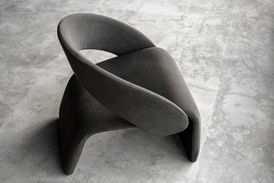 Poltrona orgânica que entrelaçam duas alças em sentidos opostos, desenho de força simples e sincero a característica de móveis dos anos 70.